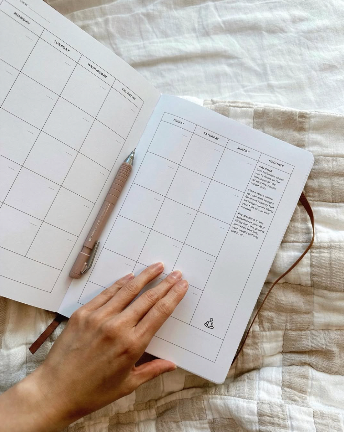 A calendar-view of your entire month with monthly meditation techniques to help increase focus, reduce stress, and guide